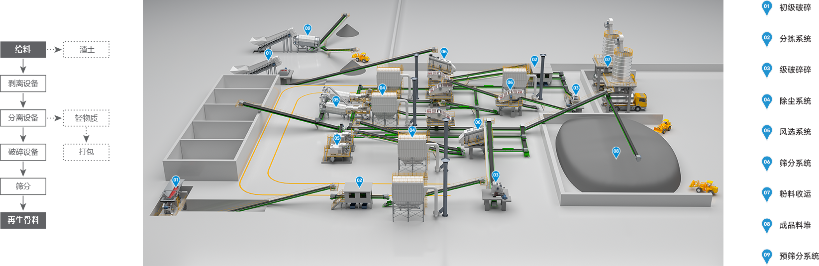 多元化除杂,风选、水浮选磁选等多种模块可有机结合,实现精细分拣,再生骨料洁净度高。