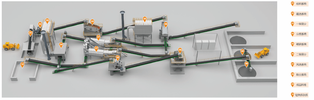 多元化除杂,风选、水浮选磁选等多种模块可有机结合,实现精细分拣,再生骨料洁净度高。